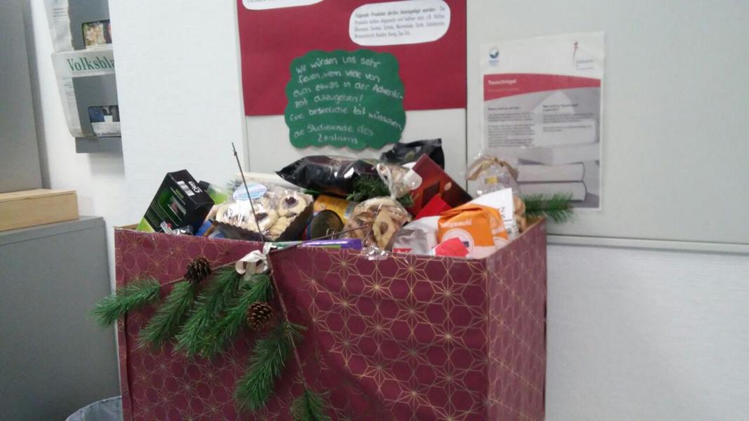 Wir hatten im Advent im Kilianeum eine Kiste aufgestellt, wo die MitarbeiterInnen und Gäste die letzten Wochen haltbare und nützliche Sachspenden abgeben konnten, die nun der Wärmestube der Christophorus-Gesellschaft zu Gute gekommen sind - und was dabei zusammengekommen ist, ist wirklich sensationell: von Socken über Kaffee, Punsch und Schals bis hin zu Plätzchen war wirklich alles dabei.